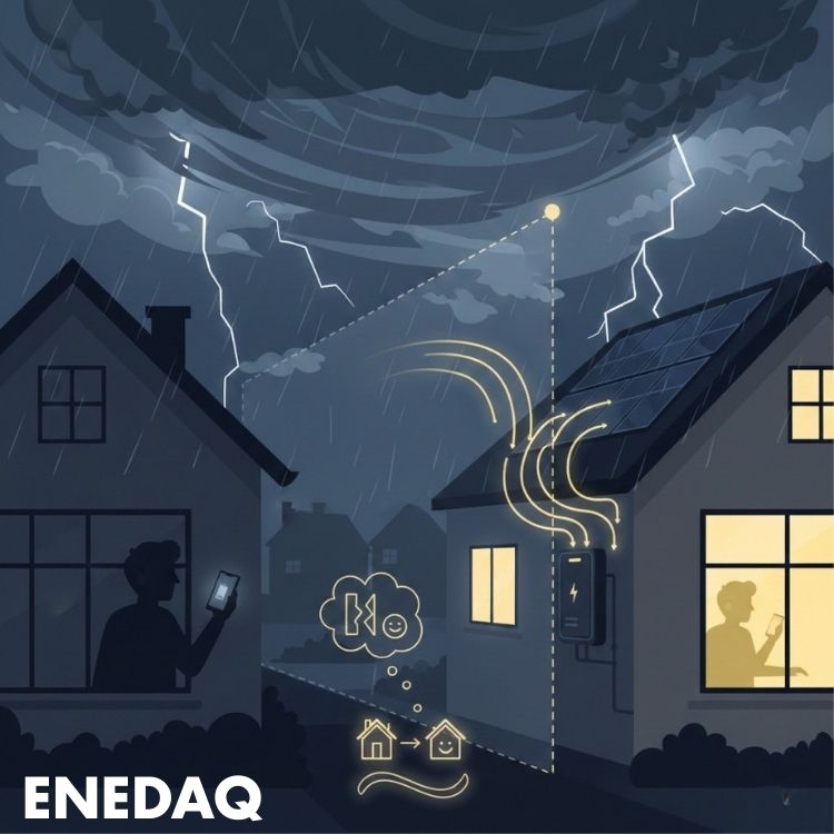 でも、その電気をあなたの家に分けてもらうことはできません。お隣さんの蓄電池には電気が余っているのに、壁一枚隔てたあなたの家では使えない。今の電気の仕組みには、そんな「見えない壁」があるからです。