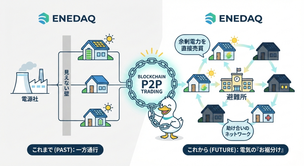 でも、その電気をあなたの家に分けてもらうことはできません。お隣さんの蓄電池には電気が余っているのに、壁一枚隔てたあなたの家では使えない。